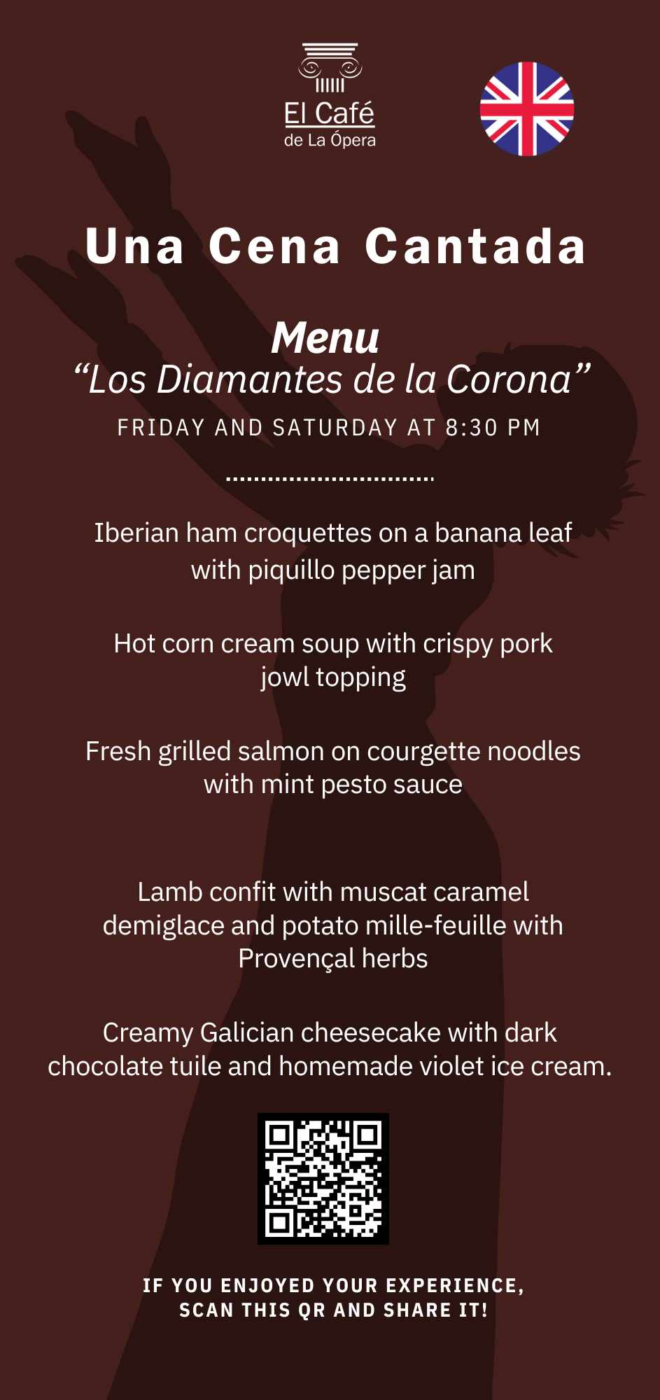 At El Café de la Ópera it is essential to explain to our customers how the booking process for “Una Cena Cantada” works. As it is a dinner with a show, the team that makes it possible needs to plan in advance the arrangement of tables, space for the singers and the gastronomic preparation. Therefore, at the time of booking, your reservation must be guaranteed with a credit or debit card.